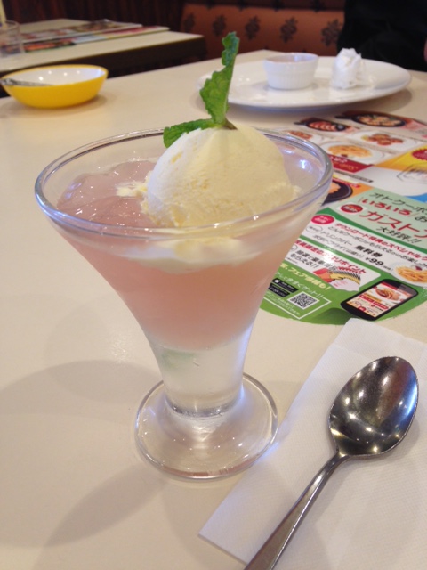 白桃ゼリーバニラアイス添え、というのを頼みました。プルプルした白桃ゼリーの上にバニラアイスが乗っているんですけど、ソフトクリームじゃないのでアイスを掬おうとすると下のゼリーがにょろっと動くので食べづらい(笑)でもバニラアイスはカレーの後に食べると口の中がさっぱりするねぇ~。美味しかった(^^)