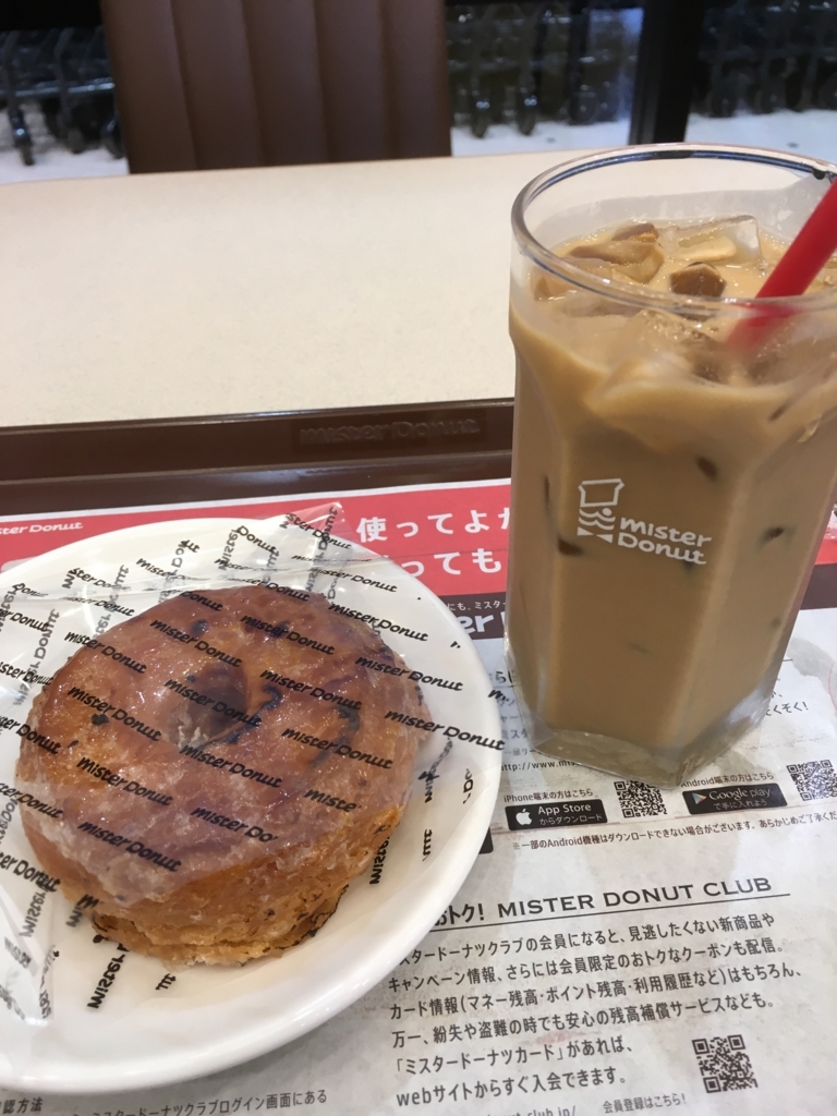 リハビリが終わったあと、買い出しがあるので、いつもの西友へ行きました。パパが買い物に行ってきてくれている間にミスドで一休み。