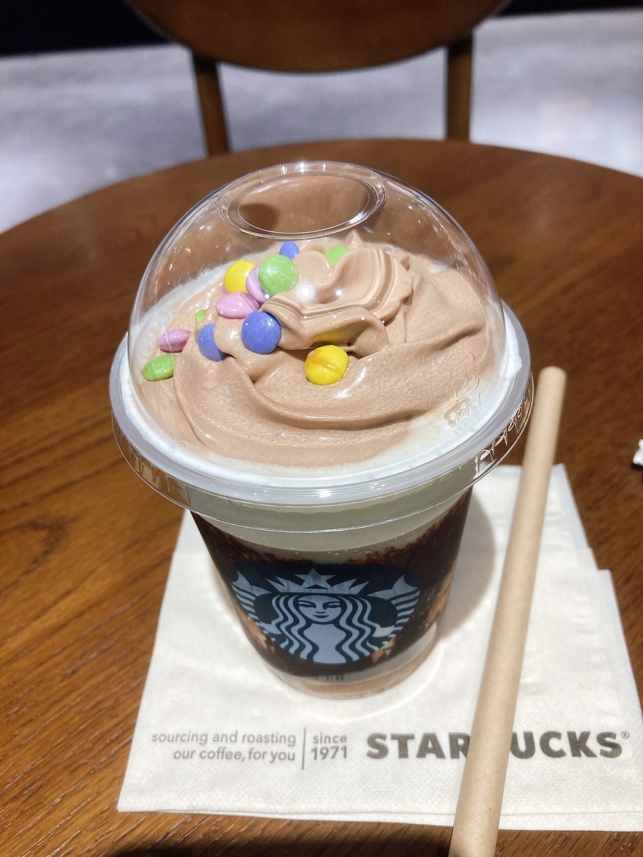 カラフルなチョコがトッピングされていて、「え?これストローで吸い上げられるんだろうか?」と思いましたが、ストローも太くて問題ありませんでした。ストローの途中で止まったりしないかなとも思いましたが、それもありませんでした(笑)