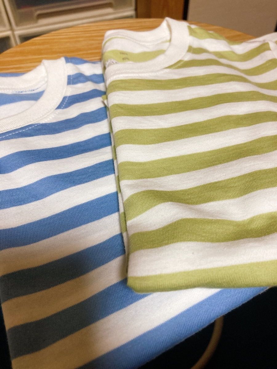 いかにも無印らしいボーダーです。ブルーとグリーンです。無地のもあったんだけどね。息子は何か柄があったほうがいいかなぁとか無地でも白に近い淡い色よりもネイビーとかの方がいいかなとかちょっと迷いましたが、結局ボーダーになりました。